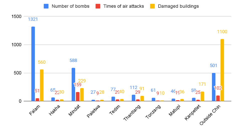 စစ်ကော်မရှင်၏ လေကြောင်းတိုက်ခိုက်မှု အကြိမ် ၃၃၀ ကျော်တွင် မင်းတပ်မြို့နယ်တွင် အကြိမ် ၁၀၀ ကျော်ဖြင့် အများဆုံး ဖြစ်ကာ ချင်းပြည်နယ်ပြင်ပ(စစ်ကိုင်းတိုင်း၊ မကွေးတိုင်း၊ ရခိုင်ပြည်နယ်) ရှိ ချင်းလူမျိုးများ နေထိုင်ရာဒေသများ၌ အကြိမ် ၈၈ ကျော်ဖြင့် ဒုတိယ အများဆုံးဖြစ်သည်။ ချင်းပြည်နယ်အတွင်း အကြိမ် ၃၀ ကျော်ဖြင့် ဖလမ်းမြို့နယ်တွင် ဒုတိယ အများဆုံးဖြစ်သည်။ သို့သော် စစ်ကော်မရှင်၏ ဗုံးကြဲကျမှုရေတွက်ရာတွင် ဖလမ်းမြို့နယ်တွင် ဗုံးအလုံးပေါင်း ၁,၃၅၀ ကျော်ဖြင့် အများဆုံးဖြစ်ပြီး ဗုံးအလုံးရေ ၆၁၁လုံးကျော်ဖြင့် မင်းတပ်မြို့နယ်တွင် ဒုတိယအများဆုံးနှင့် ချင်းပြည်နယ် ပြင်ပ ချင်းလူမျိုးများ နေထိုင်ရာဒေသများတွင် ဗုံးအလုံးရေ ၅၅၀ ကျော်ဖြင့် တတိယ အများဆုံး ဖြစ်သည်။